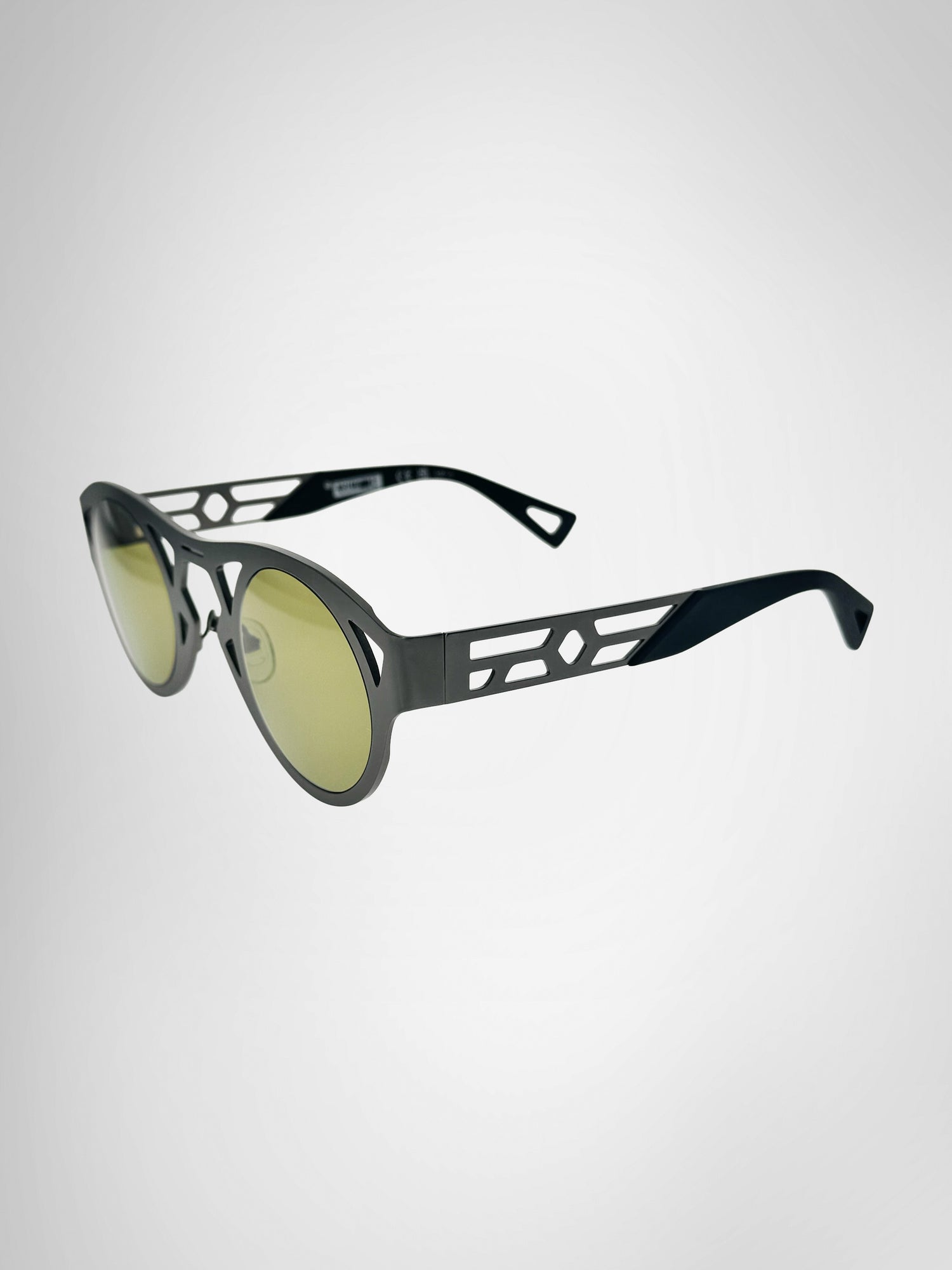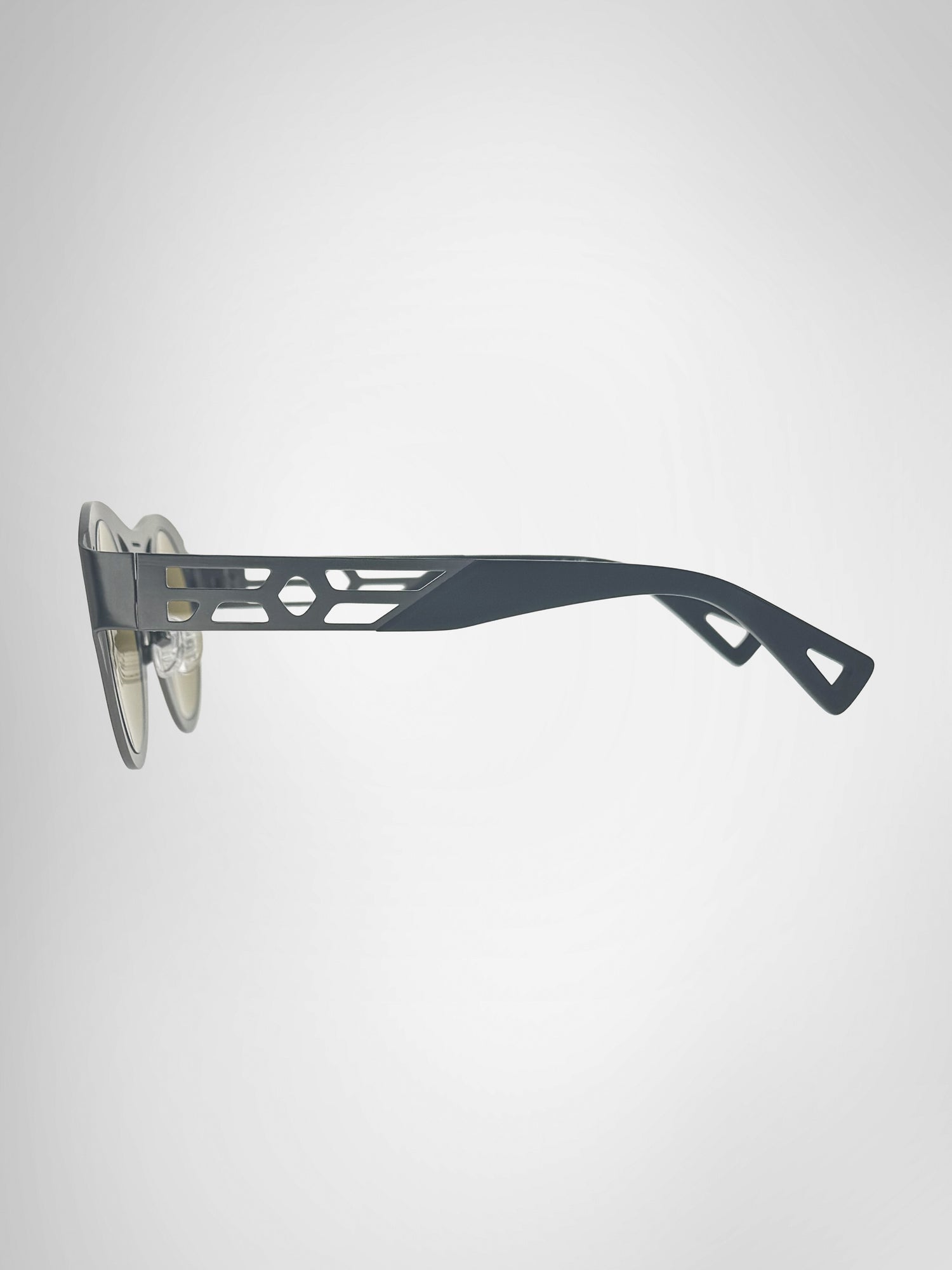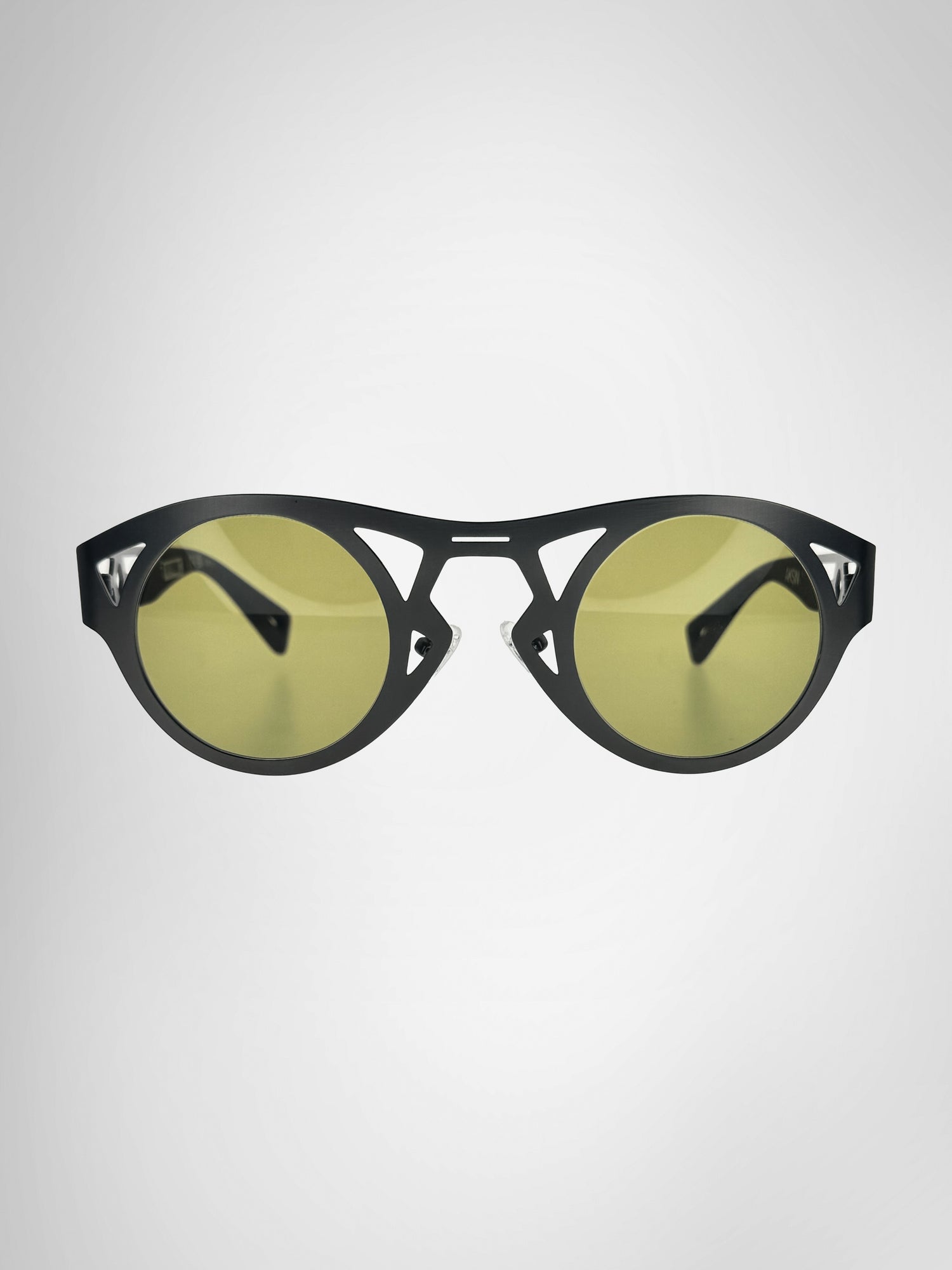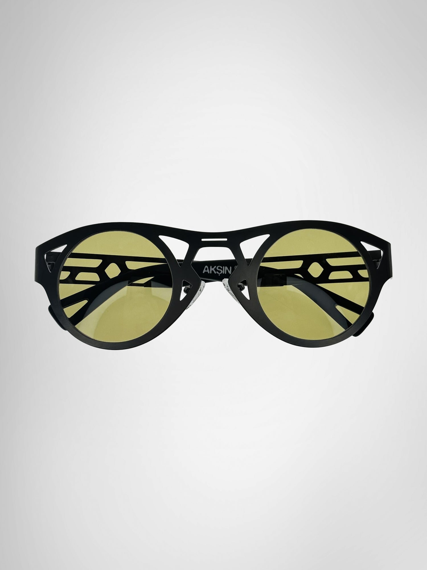 AKṢIN reimagines the ancient concept of Drishti through a modern, architectural form, crafted in matte gunmetal with black acetate temples and an open‑frame lattice inspired by the flow of life‑force energy. Reflecting how jealousy or negative thoughts can disrupt one’s aura, this design transforms that idea into strength: a sleek, sculptural shield that channels clarity, intention, and presence. Futuristic yet rooted in tradition, AKṢIN elevates protection into style.
